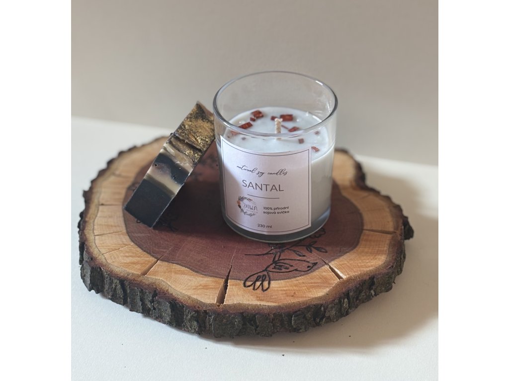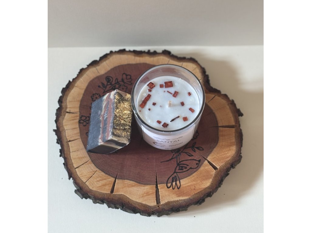Dárkový balíček, který obsahuje: ručně vyráběné prkýnko, svíčku s vůní Santalové dřevo + Africké mýdlo.