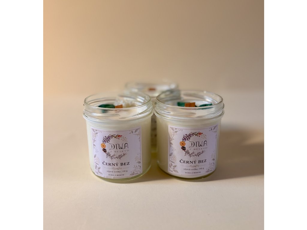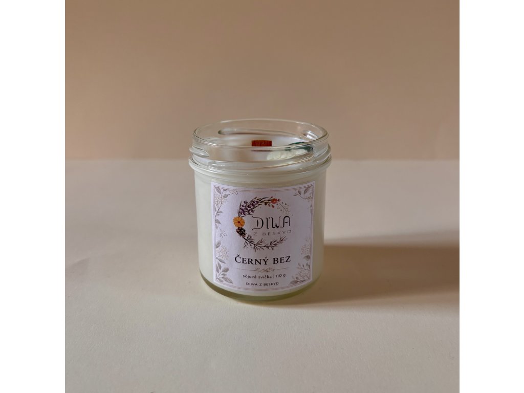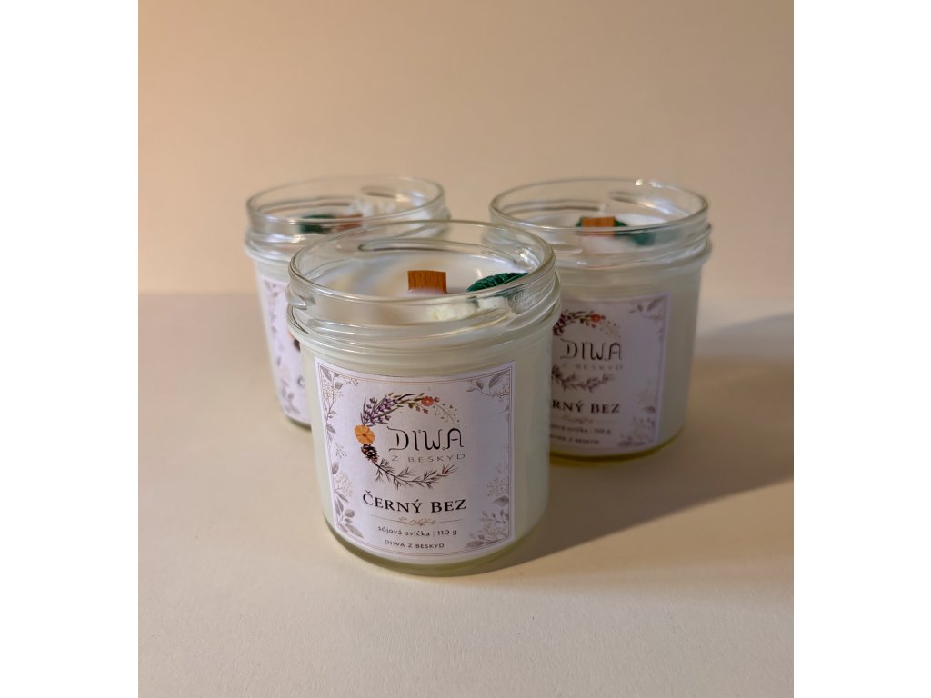 Obsahuje: 100% sójový vosk, EO Černý Bez, dřevěný knot