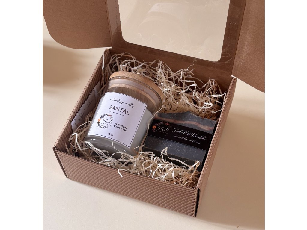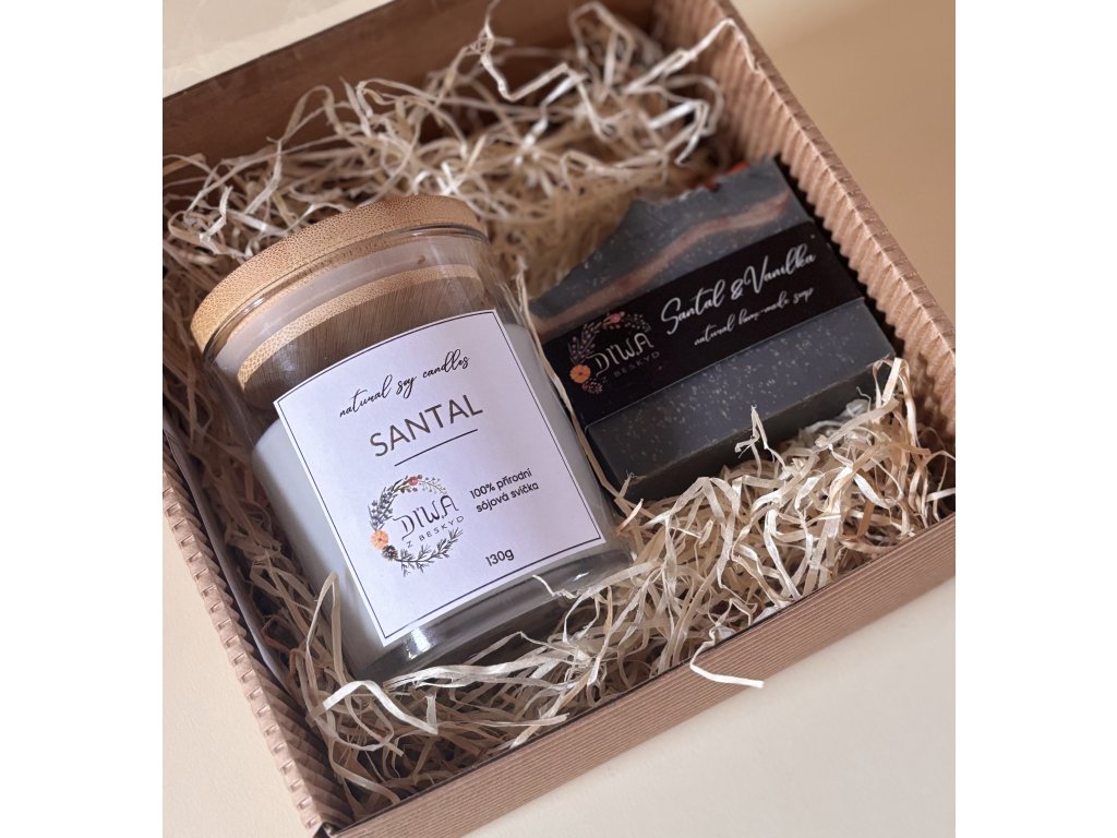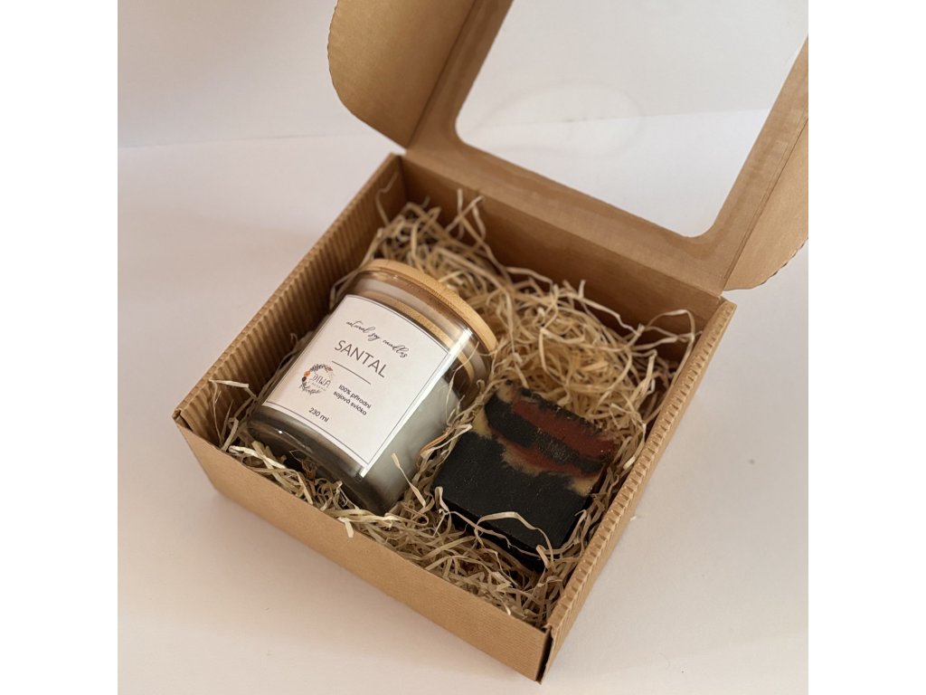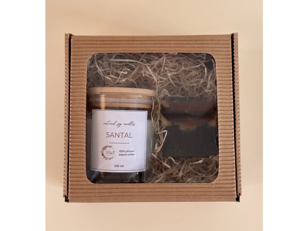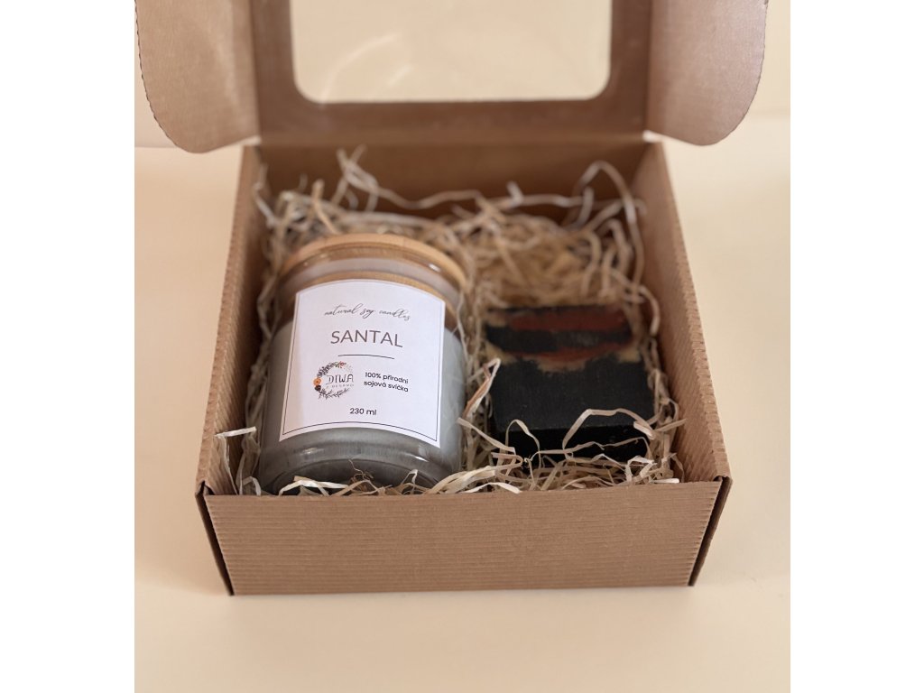 Akční dárkový balíček obsahuje sojovou svíčku Santal a přírodní mýdlo Dotek Afriky. Baleno v dárkové krabičce.