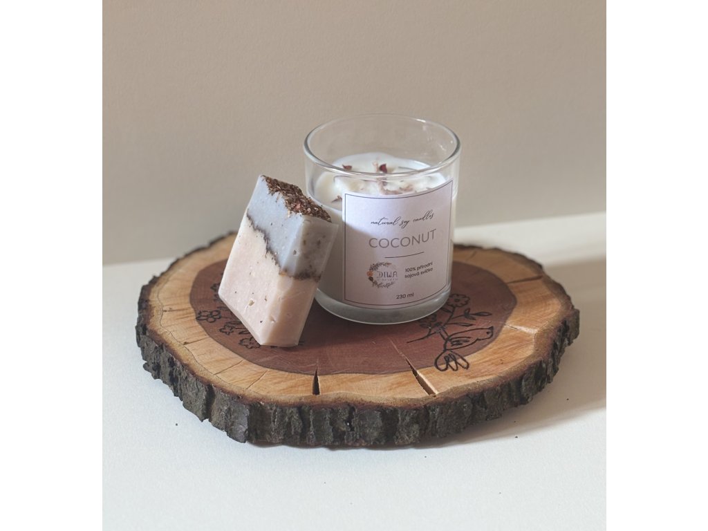 Dárkový balíček, který obsahuje: ručně vyráběné prkýnko, svíčku s vůní vůni kokosu + mýdlo Kokos & Růže.