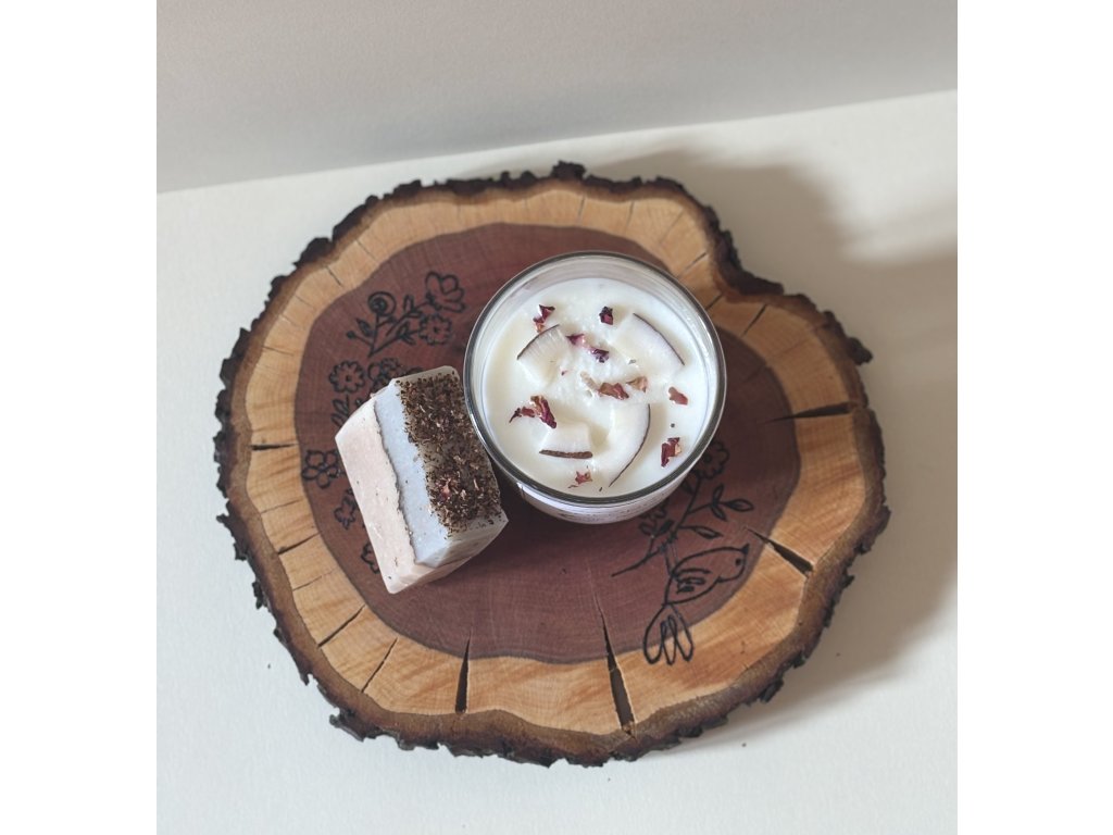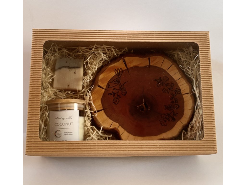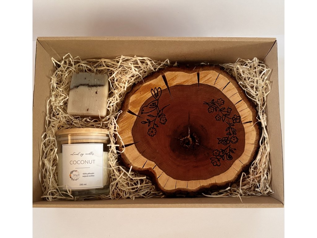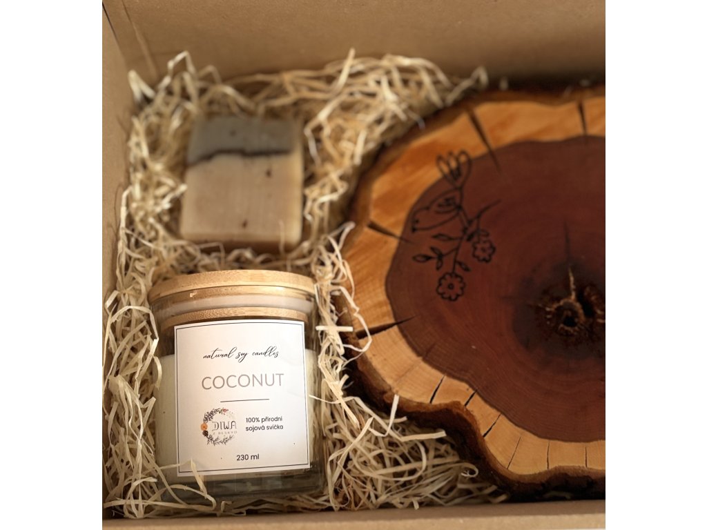 Dárkový balíček, který obsahuje: ručně vyráběné prkýnko, svíčku s vůni kokosu + mýdlo Kokos & Růže.