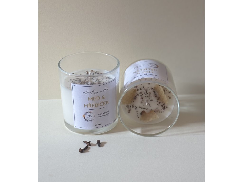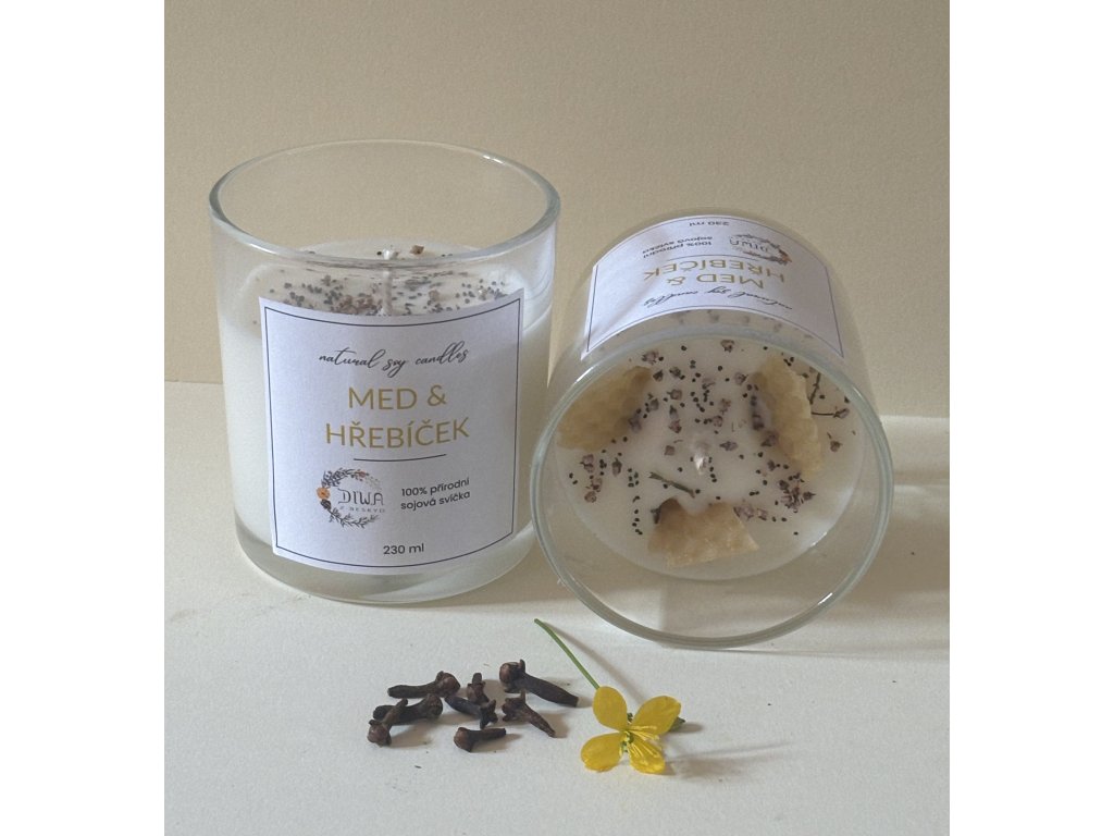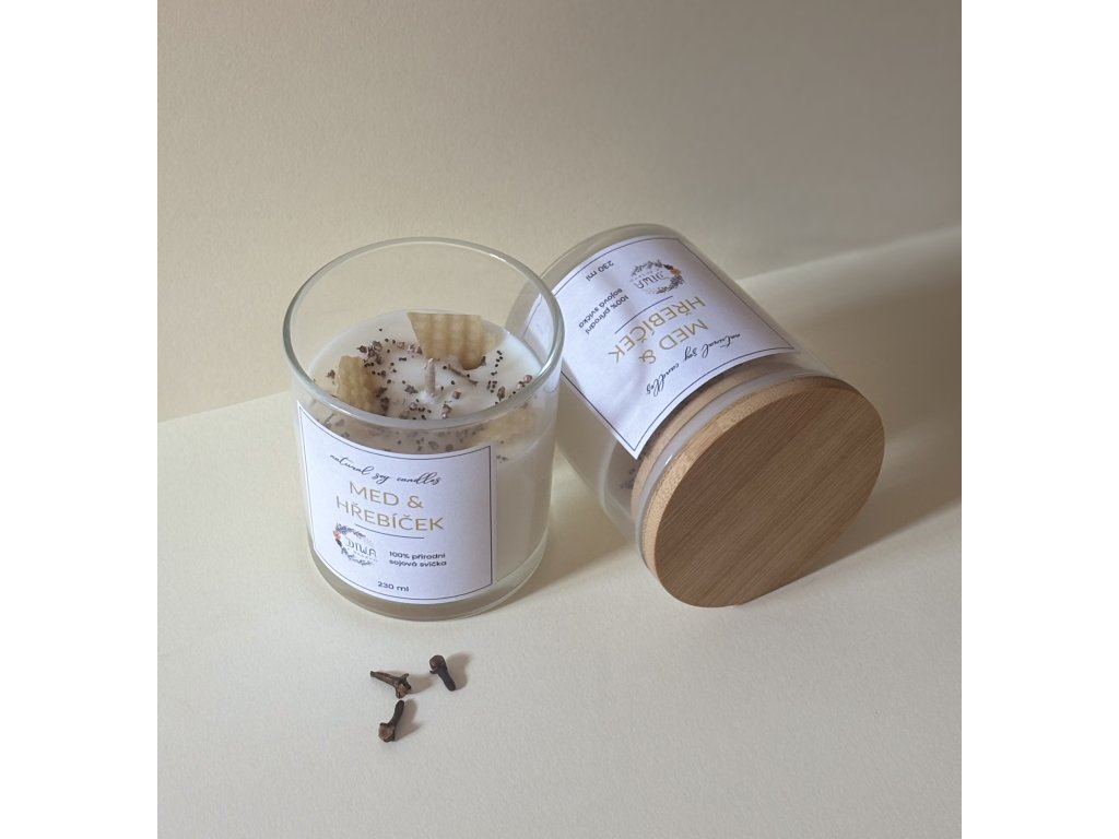 Sojová svíčka ze 100% přírodního sojového vosku s esenciálními oleji Med a Hřebíček tvoří jedinečné spojení, které propojuje sladkou jemnost s kořeněnou zemitostí. Tato kombinace voní jako teplé objětí – je hřejivá, uklidňující a přitom má lehký nádech exotiky.