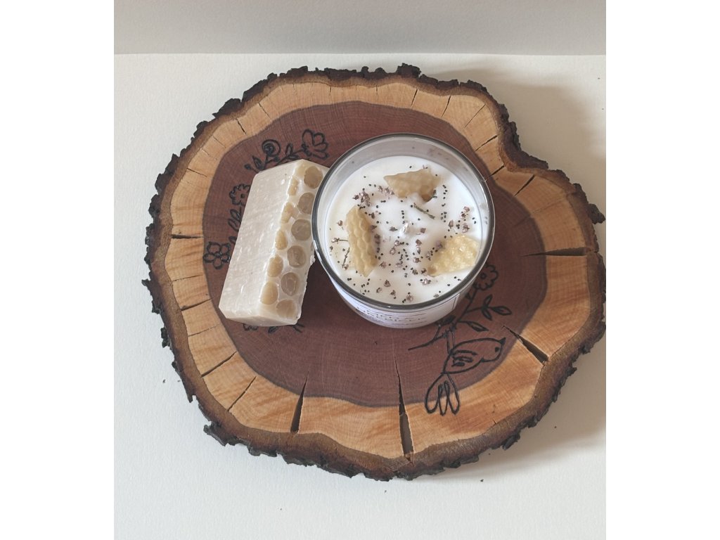 Dárkový balíček, který obsahuje: ručně vyráběné prkýnko, svíčku s vůní med a hřebíček + medové mýdlo.