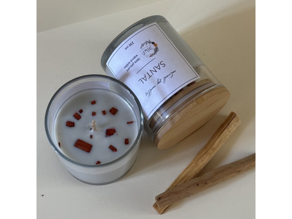 Ručně odlévaná svíčka ze sojového vosku s vůní Santalového dřeva byla vytvořena pro uzemnění a navození pocitu bezpečí a vnitřního klidu.