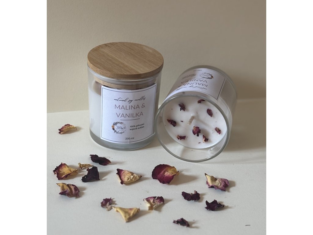 Ručně odlévaná sojová svíčka s vůní Vanilky a Maliny byla vytvořena pro povbuzení dobré nálady a hravosti.